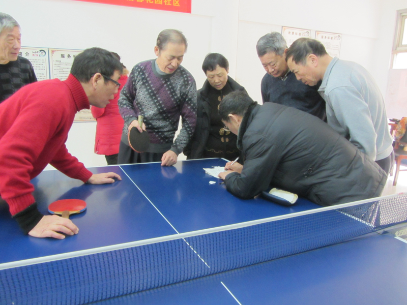 2015年12月30日下午2点由社区居民自主组织,社区承办的居民乒乓球比赛准时开赛,此时我怡馨花园社区举行的居民乒乓球比赛活动正激烈地进行着。