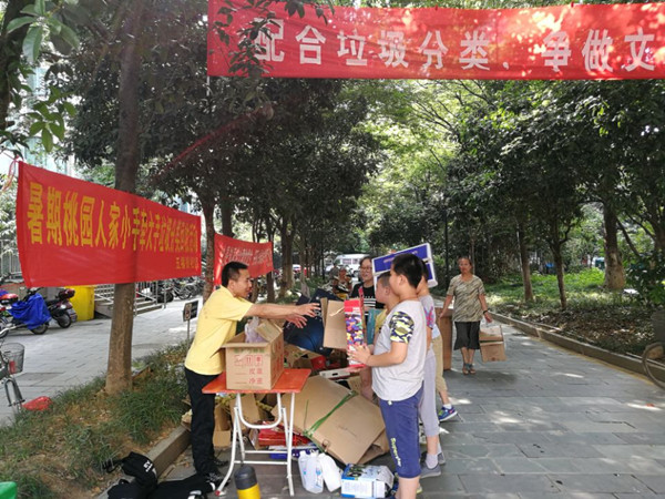 7月17日下午,五福街社区携手桃园人家的中住物业共同举办了一场暑期小手牵大手垃圾分类回收活动,社区内众多青少年和其家长带着废旧纸盒、报纸以及塑料瓶来参加兑换活动,活动现场热闹非凡!垃圾分类活动的举办旨在提高社区居民的垃圾分类意识,通过不定期的垃圾分类活动可以加强垃圾分类的宣传力度。从娃娃抓起,是一个好的开端,传递了一种积极的信号,垃圾分类可以让孩子从小培养良好的习惯,成为垃圾分类的积极践行者。同时孩子的行为也会不自觉地影响到这个家庭,让更多的人加入到垃圾分类行动中来。大家快行动起来吧!