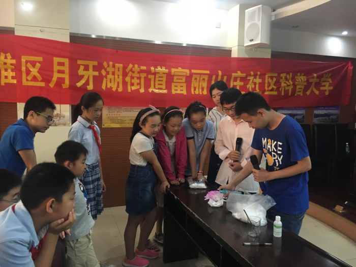 7月18日上午,在秦淮区月牙湖街道富丽山庄社区二楼会议室,南京农业大学理学院的学生们,应社区邀请为小区的孩子们带来一场别开生面的化学知识科普讲座。