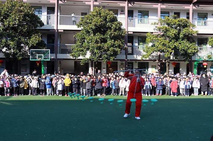 身怀绝技的秦淮区空竹协会的老师们来到瑞金北村小学御道街校区,在现场向同学们展示抖空竹的技巧。老师们提、拉、抛、接的灵活手法,通过音乐、舞蹈、杂技等艺术形式与空竹结合为一体,演出具有观赏性和创新性的空竹表演节目。空竹在她的手中,时上时下,起起伏伏,不时就飞出一道优美的弧线,吸引着同学们的眼球。