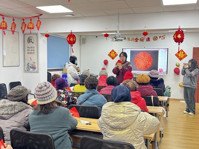 活动组织者邀请了专业剪纸艺人,通过生动有趣的讲解和示范,展示了传统剪纸的制作技艺,从构思图案到剪纸创作的全过程,让居民们直观感受到非遗剪纸的精妙与艺术。接下来就是亲自体验环节,社教志愿者向参加活动的老人们细致讲解了剪纸方法,并从折纸、标记线条等方面传授技巧经验。一张张红纸在老人们的手中逐渐变成了一幅幅精美的剪纸作品,从简单的传统图案到富有创意的设计,居民们的作品既有传统韵味,又展现了个人独特的艺术风格,整个过程充满了欢声笑语。这些剪纸作品不仅装点了社区的节日氛围,更让老人们在活动中感受到了传统文化的魅力,传承了中华民族的优秀文化。