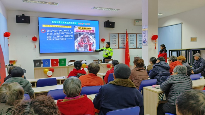 交通安全知识讲座:邀请交警二大队警官,为社区老年人开展交通安全知识讲座。讲座内容涵盖交通信号灯、斑马线、安全头盔和安全带的使用、不酒驾、不疲劳驾驶、不占用机动车道等交通安全常识,以及如何在紧急情况下保护自己的方法。