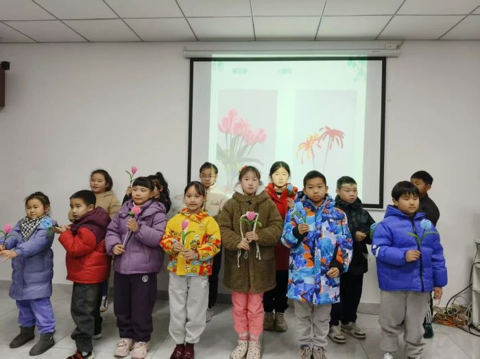 制作过程中,在老师与社区工作人员的悉心指导下,孩子们全神贯注,扭、弯、折,将扭扭棒精心塑造成心中所想的形状并拼接。很快,一朵朵形态各异、栩栩如生的扭扭花在孩子们手中绽放。大家拿着作品相互分享、交流、展示,最后一起举着作品合影留念,脸上洋溢着自豪与喜悦。