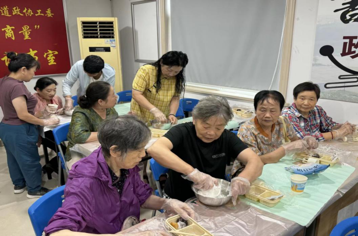 随后的冰皮月饼手工制作环节,将活动气氛推向高潮。社区提前备好冰皮预拌粉、红豆沙、奶黄等馅料,以及模具、揉面垫等工具。居民们戴上一次性手套,跟着指导步骤,先将预拌粉加水揉成光滑面团,再分份包入馅料、搓圆压模,一个个造型精致的冰皮月饼很快成型,大家还将成品装入包装盒,满心欢喜。现场居民默契配合,邻里间互相分享制作技巧,欢声笑语不断。