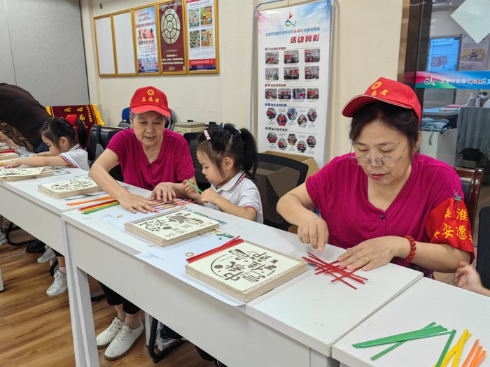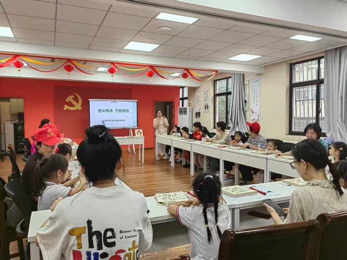 活动的核心环节——竹编画制作正式拉开帷幕。老师首先指导家长们掌握基础的竹编技法,再由五老志愿者们作为“第一导师”,协助孩子固定竹丝、拼接框架。只见五老志愿者们神情专注,手把手地传递给孩子们编织的技巧,共同制作非遗竹编画。志愿者老师们穿梭其间,及时提供帮助,整个会场洋溢着专注、合作与创造的喜悦。活动在欢声笑语中圆满落幕,一件件融合了传统技艺与童真创意的竹相框画作品陆续完成。