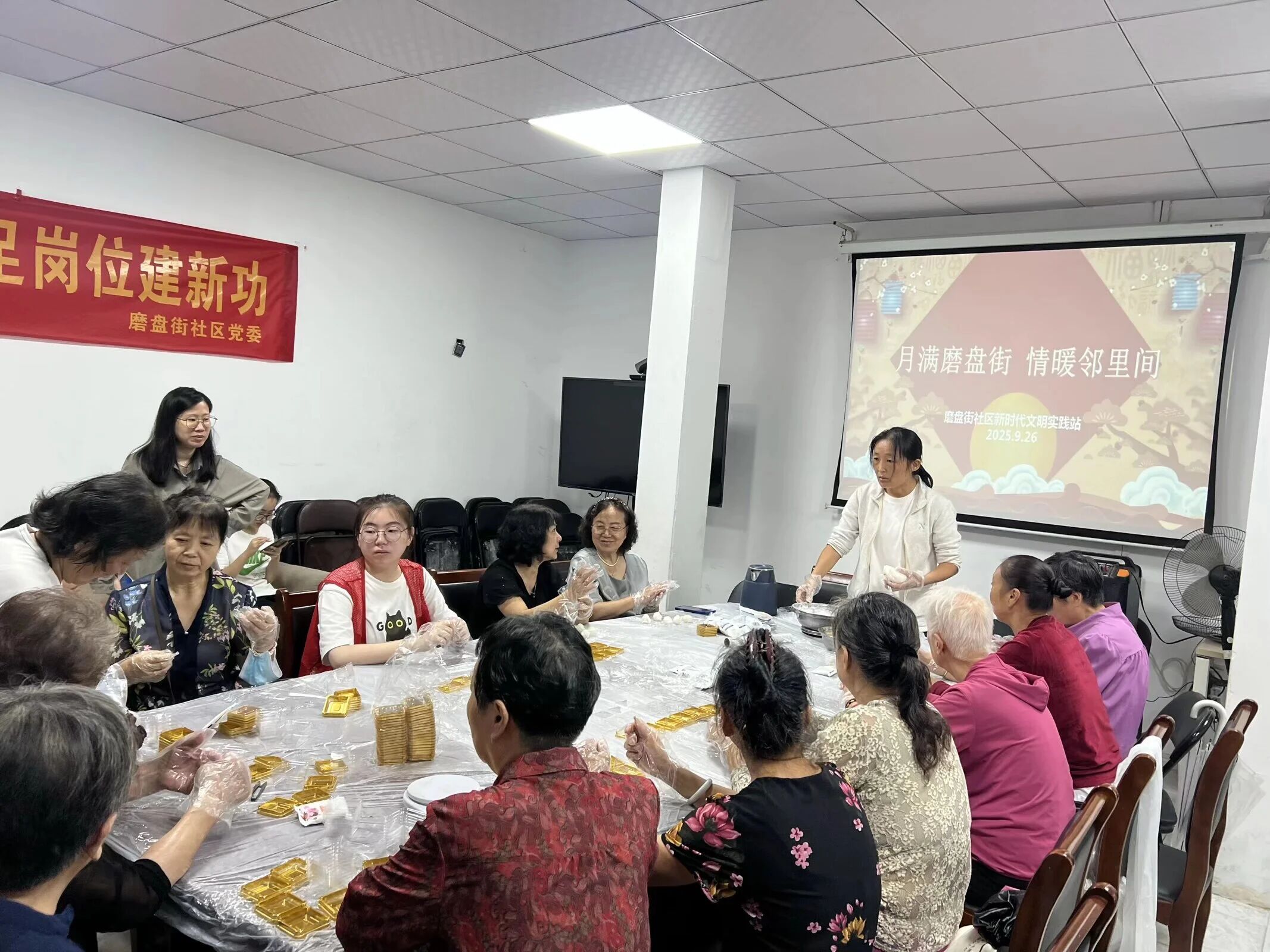 “以前都是买月饼,这次亲手做,感觉特别有意义!”居民周阿姨笑着展示自己的成果。茶歇时段,大家品着南京雨花茶,交流制作心得、回忆磨盘街变迁,邻里情谊在茶香与笑语中悄然升温。活动后,社区工作人员还特意将月饼送至空巢独居老人家中,让温暖直抵心间。