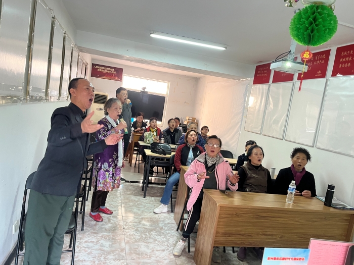 讲解环节结束后,活动进入合唱互动环节。志愿者老师带领居民们逐句学唱、反复练习,从节奏把控到情感表达,耐心指导每一个细节。居民们热情高涨,精神饱满,跟着旋律认真演唱;邻里之间相互提醒歌词、配合节奏,现场充满了温暖与默契。当熟悉的旋律响起,“没有共产党就没有新中国,没有共产党就没有新中国……”的歌声整齐嘹亮,回荡在社区活动现场,不仅唱出了对祖国的深情祝福,更唱出了邻里同心、共筑美好家园的共同心愿。