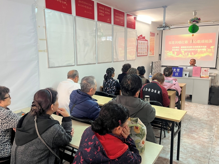 活动特邀专业志愿者老师现场授课,老师以“红歌里的时代故事”为切入点,生动讲解了《小白杨》《红歌照我心》《没有共产党就没有新中国》等经典红歌的创作背景与时代意义。在讲解《小白杨》时,老师结合歌曲背后戍边战士的故事,让居民们理解旋律中蕴含的坚守与奉献;谈及《没有共产党就没有新中国》,则通过回顾歌曲创作时的历史语境,帮助大家深刻体会“党带领人民走向幸福生活”的核心内涵,让每一首红歌都成为鲜活的“红色教材”。