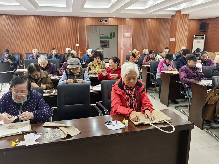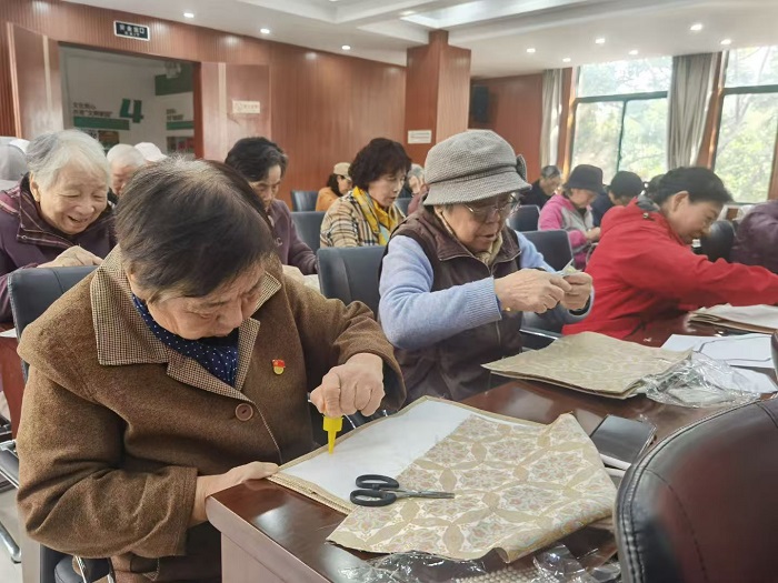 活动前期,社区工作人员精心挑选了适合老年人操作的宋制包材料包,涵盖素色绸缎、精美绣线、复古铜扣等配件,并提前布置活动现场,营造出浓厚的节日氛围。活动当天,现场欢声笑语不断。