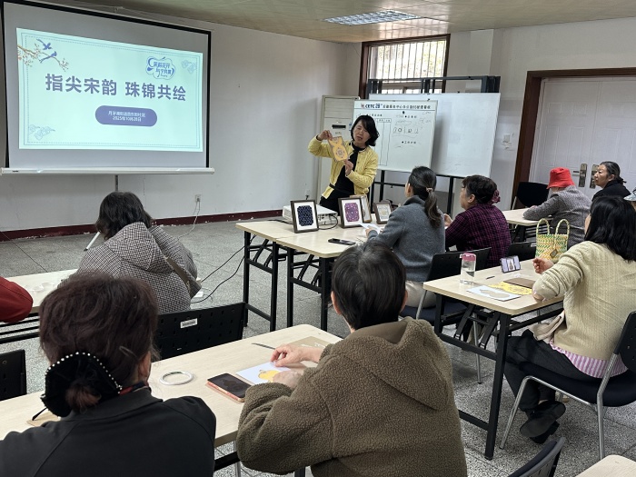 “指尖宋韵·珠锦共绘”——宋锦珍珠画DIY活动率先拉开帷幕,让老人们沉浸式体验非遗工艺的魅力。志愿者们采用“拉家常”式的讲解方式,从“葫芦-福禄”的吉祥寓意,到“珍珠粘贴三步法”,全程语速缓慢、手把手示范,确保每个细节都清晰易懂。此外,还贴心地准备了防滑镊子和放大镜,使老人们的操作更加得心应手。