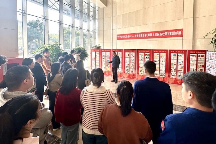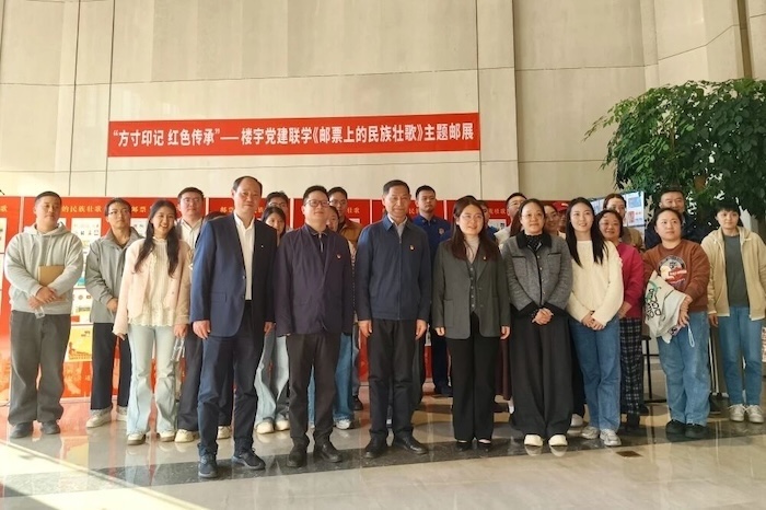为深入学习贯彻党的二十届四中全会精神,创新楼宇党建载体,丰富党员教育形式,11月5日下午,朝天宫街道在平安金融中心隆重举行“方寸印记 红色传承”楼宇党建联学启动仪式暨《邮票上的民族壮歌》主题展。朝天宫街道党工委书记刘文洪,南京市秦淮玄武区邮政分公司党总支书记、总经理赵俊成,朝天宫街道党工委副书记、政法委员王俊霞,南京市秦淮玄武区邮政分公司党总支委员、副总经理田鹏,江苏省省级机关老干部集邮协会会长、南京市集邮协会理事李恒平,以及平安金融中心楼宇党建联席会各成员单位党员代表近50人参加活动。