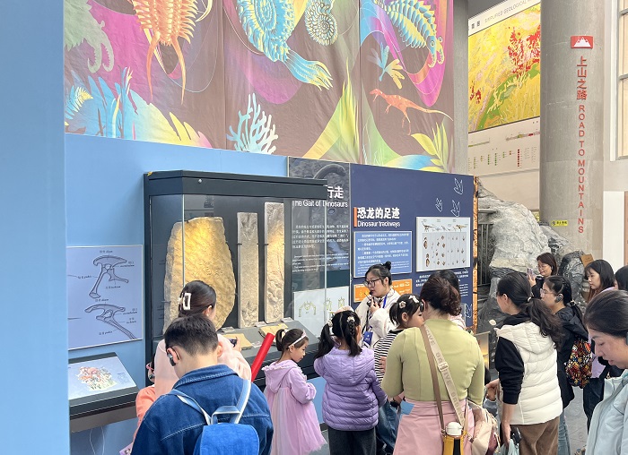 活动伊始,大阳沟社区与南京银行光华支行的志愿者们为每个家庭送上亲切的问候与活动材料,现场气氛温馨而热烈。在博物馆专业讲解员的引导下,孩子们和家长们一同“穿越”亿万年时光,从寒武纪的生命大爆发到恐龙的称霸与灭绝,再到哺乳动物的兴起,深入了解了地球生命演化的壮丽史诗。栩栩如生的化石标本、精美的复原模型和生动的场景再现,引发了孩子们的阵阵惊叹与好奇的提问,家长们也沉浸其中,与孩子一起讨论、学习,共同感受科学的魅力。