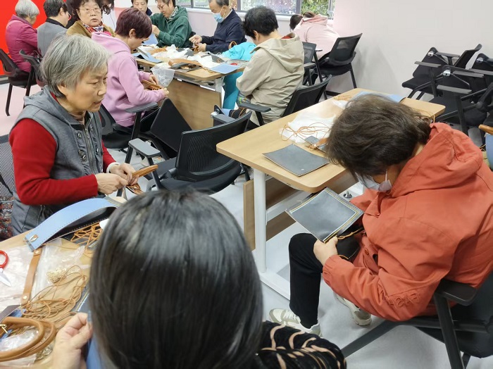 手工创作环节,活动室里暖意融融、笑语不断,在志愿者的协助下,手工包逐渐成型,遇到操作难题时,志愿者们耐心示范、手把手教学;邻里之间也相互交流技巧,分享创作心得,现场氛围热闹而温馨。