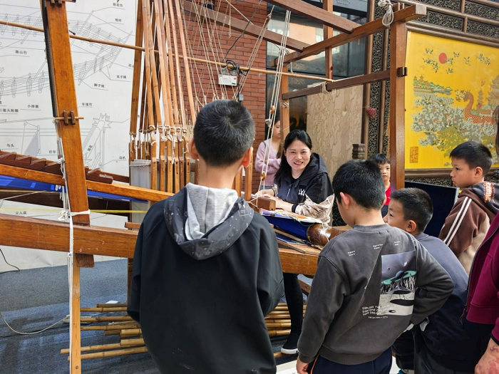 第一站,亲子家庭走进金陵兵工展览馆。国防科技工业军工文化专家宋建中老师现场为大家讲解,从中国第一挺马克沁机枪的诞生故事,到兵工先辈们 “自强求富、实业救国” 的初心使命。一张张老照片、一件件实物展品,让孩子们深刻理解了园区160年背后的红色基因与匠心精神。孩子们听得聚精会神,在触摸历史、感知精神的过程中,爱国情怀与匠心种子悄然萌发。随后,大家参观了永银钱币博物馆,开启钱币文化探索。馆内历代钱币琳琅满目,每一枚都承载着独特的时代印记。家长与孩子一同观察钱币形制、纹样与文字,了解不同朝代的经济文化风貌。家长和孩子们在欢声笑语中收获了丰富的知识,也加深了对中华传统文化的认知。最后一站,亲子家庭在展厅沉浸式感受云锦的魅力。承创非遗实践基地的老师向大家介绍了云锦的复杂织造技艺与深厚文化内涵,让家长和孩子们对这一非遗技艺有了全面了解。随后,在非遗老师与志愿者的指导下,亲子家庭默契配合,动手制作云锦剪贴画。孩子们脸上洋溢着满满的成就感,也在亲手创作中传承了非遗文化。