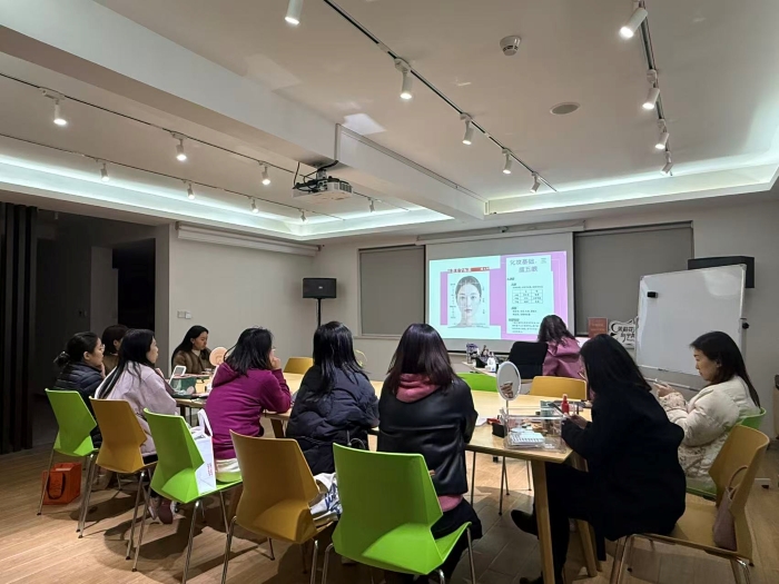 课程开始,老师安排了“女性形象与心理健康”互动环节,引导学员探讨外貌焦虑、职场形象管理等话题,鼓励女性打破刻板印象,建立积极健康的自我认知。现场的小伙伴们积极参与到分享互动中,很快拉近了彼此的距离。随后,讲师从肤质分析、化妆品选用、色彩搭配等基础知识入手,逐步教授日常化妆实用技巧,并针对不同脸型、年龄段的女性提供个性化指导。