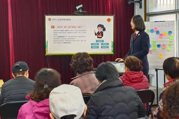 陶李王巷社区联合秦淮区检察院的检察官们,为辖区内老年居民、退休干部、养老服务工作者举办了一场《中华人民共和国老年人权益保障法》解读讲座。检察官结合真实案例,深入解读了老年人最关切的几类权益问题。在家庭赡养方面,阐释了赡养人应承担的经济供养、生活照料与精神慰藉义务,强调赡养不仅是物质保障,更须注重情感关怀,杜绝“精神赡养缺失”“变相遗弃”等行为,并介绍了赡养纠纷的常见类型与维权途径。财产保护方面,重点剖析了房产赠与、遗产继承及“以房养老”、虚假投资等诈骗陷阱,提醒老年人注意合同规范、遗嘱形式等法律细节,谨慎处置财产,提醒老年人保持警惕,遇到不确定的事项及时咨询法律专业人士。