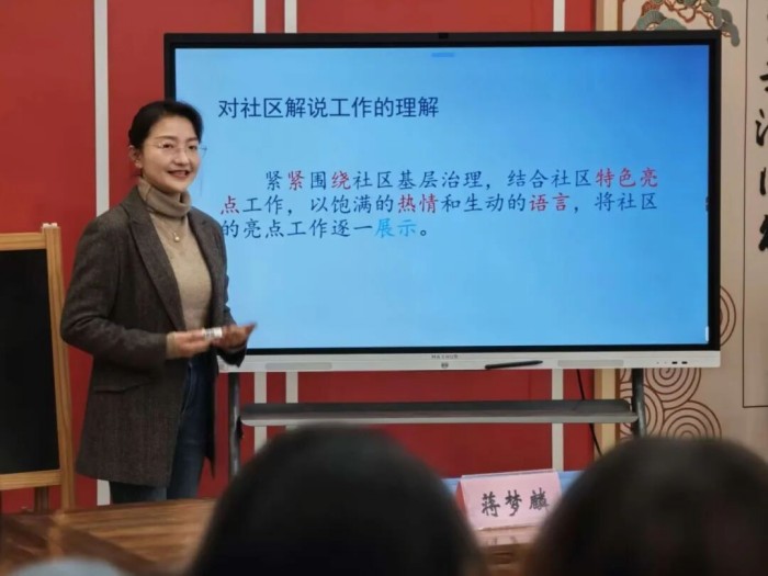 随后的环节将培训推向高潮。各社区选派的讲解员依次登台,围绕本社区在“一社一品”、居民自治、为民服务等方面的核心成果,进行脱稿模拟讲解。短短几分钟内,她们将社区的特色工作、感人故事娓娓道来,完成了一场场生动的“社区路演”。