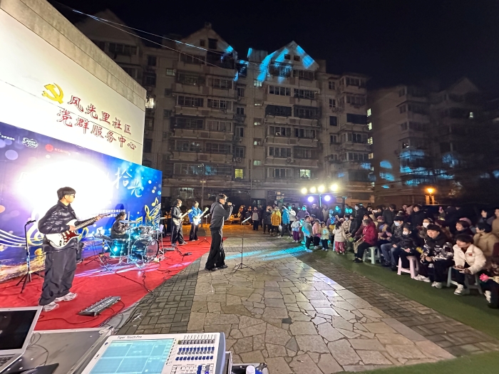 来自高校学生自发组建的乐队:不止派对,活力登场,这群怀揣音乐梦想的年轻人,用最饱满的热情与专业的演奏,为居民们带来一场沉浸式的视听盛宴。音乐会在鼓手solo的《恭喜发财》中激情开场,铿锵有力的鼓点瞬间点燃现场氛围,仿佛将新年的喜庆与祝福提前送到大家身边;紧接着,《海阔天空》的激昂旋律奏响时,乐队成员全情投入,台下居民也跟着放声高歌,让满腔热血与豪情在夜色中尽情释放。