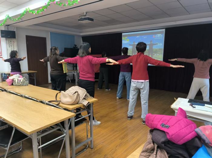 八段锦作为国家级非物质文化遗产,深受广大中老年人喜爱。活动中,朱老师对八段锦的每个动作进行了分解讲解与示范,带领大家反复练习,并不时强调易错之处。其风趣幽默的授课风格,赢得了现场学员的广泛欢迎。