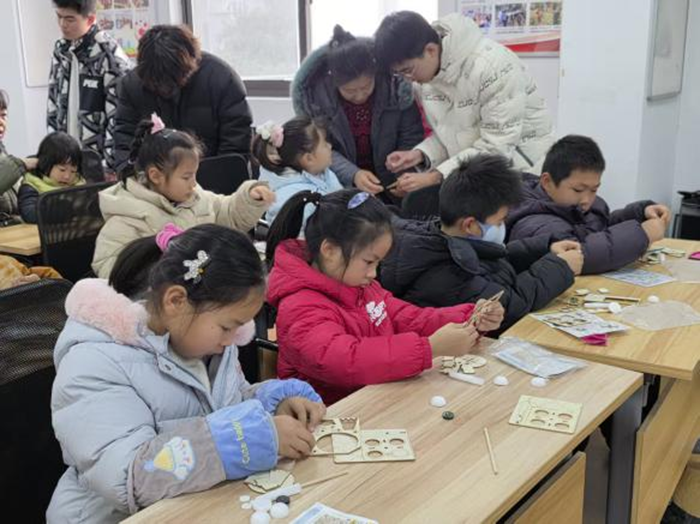 “小朋友们,你们知道风是从哪里来的吗?”志愿者老师刚抛出问题,教室里就炸开了锅。“从天上吹下来的!”“是大树摇出来的风!”老师举起的风向标模型,小风扇吹动模型,箭头始终指向同一个方向。“这就是能听懂风说话的工具——风向标。”老师一边演示模型转动,一边揭开风向的秘密:“箭头指向的方向,就是风来的方向。当东风吹来时,箭头就会指向东方。”为了让抽象的方位概念更易理解,老师还展示了简易的方位图,结合社区周边的标志性建筑讲解东西南北的方向,让科学知识与孩子们的生活场景紧密相连。“现在,我们就来制作属于自己的风向标!”孩子们兴奋地打开材料包,木质底座、旋转轴、箭头标杆、尾翼支架、泡沫小球一一摆在桌上,“箭头和尾翼的方向要相反,这样才能准确指示风向”,老师耐心地讲解着制作步骤,志愿者们则在课桌间来回穿梭,及时为孩子们提供帮助。 当一个个风向标在孩子们手中逐渐成形,大家迫不及待地举起来互相展示。“这是我的‘追风小侦探’”,孩子们骄傲地给自己的作品命名,小小的脸上写满了成就感。