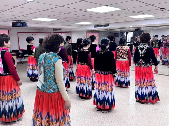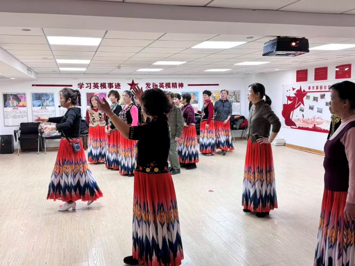 活动现场,十余名社区舞蹈爱好者身着特色民族舞裙,在专业老师的指导下,跟随节奏练习步伐与队形。老师从基础动作分解教起,耐心纠正大家的姿势和神态,学员们认真专注,反复练习旋转、摆臂等动作,活动室里洋溢着欢快的气氛。