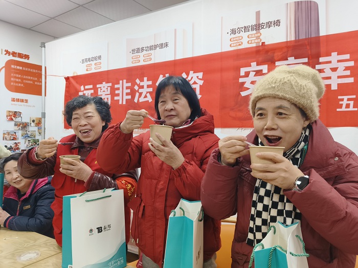 活动的最后,瑞芝康健的工作人员为现场每一位居民送上了一碗热气腾腾的腊八粥。粥里饱满的红豆、软糯的糯米、香甜的红枣,搭配着多种谷物,不仅营养丰富,更承载着浓浓的节日祝福。居民们手捧暖粥,围坐在一起,边吃边聊,脸上洋溢着幸福的笑容。“这碗腊八粥喝着真暖心,社区和养老服务中心想得太周到了!” 一位老年居民感动地说。大家在品尝美味腊八粥的同时,交流着生活趣事,分享着节日喜悦,邻里之间的距离在欢声笑语中悄然拉近。