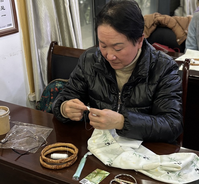 活动现场,提前备好的宋锦面料、竹节手柄、针线辅料整齐陈列,素雅的纹样与温润的竹质相映成趣。宋锦作为中国传统丝织工艺的瑰宝,素有“锦绣之冠”的美誉,其精密的织造技艺与典雅的色彩搭配,让参与居民初见便心生喜爱。大家围坐一堂,对照着简易教程,小心翼翼地裁剪面料、穿针引线,从对齐布纹到缝合边缘,从固定内衬到组装手柄,每一个步骤都专注而认真。