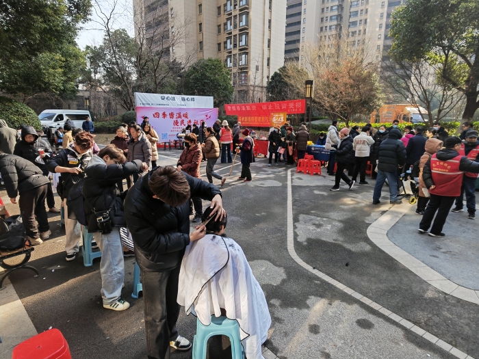 眼镜清洗与爱心义剪:超声波眼镜清洗设备即到即洗,高效便捷;4个理发位为长者优先服务,志愿者现场引导秩序,传递邻里温情。