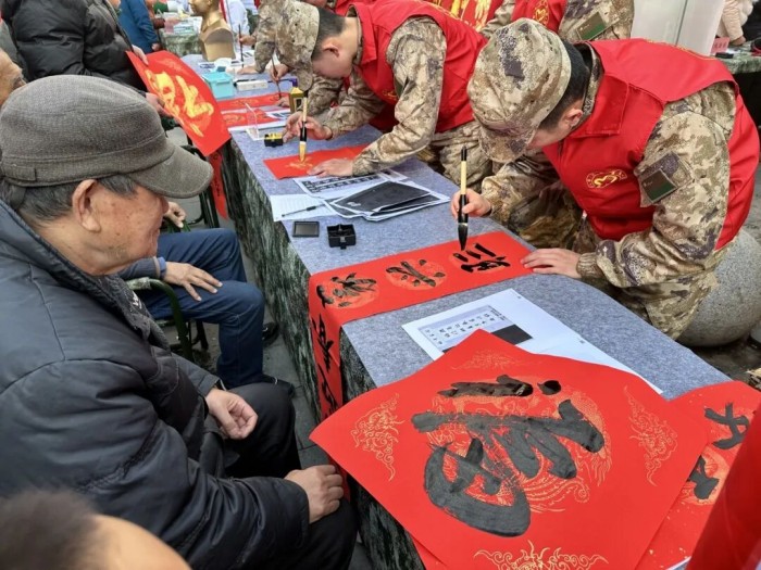 最具新春气息的当数写福字送春联环节。社区教育志愿者与官兵们挥毫泼墨,一副副寓意吉祥的春联、一个个遒劲有力的“福”字跃然纸上,被居民们争相领取。大家手捧满载祝福的春联,脸上洋溢着幸福笑容,现场满是浓浓的年味儿。
