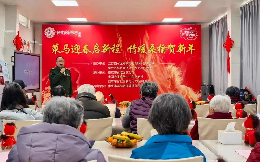 金龙辞旧岁,骏马迎新春。在2026年新春佳节即将来临之际,为弘扬尊老敬老传统美德,表达对离退休老干部的崇高敬意,1月29日,西华东村社区新时代文明实践站携手江苏省军区南京第七离职干部休养所、秦淮区军队离退休干部第三休养所、秦淮区文化馆、中国农业银行中山东路支行、秦淮区梅香锡剧团,共同举办“策马迎春启新程,情暖桑榆贺新年”春节联欢会。活动依托“西华颐年・乐享家园”为老服务品牌,以歌舞传情、以祝福达意,为现场老干部献上一场温馨洋溢、敬意满满的文化盛宴。