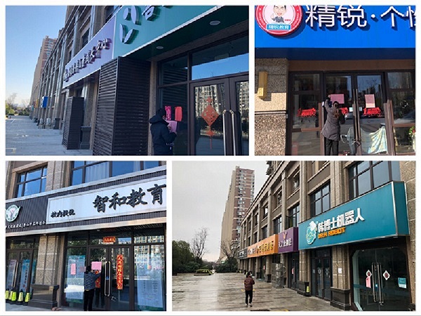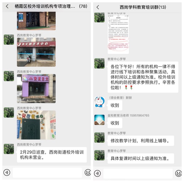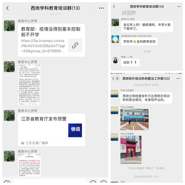“线上”通过微信群对辖区内校外培训机构及时发布通告,要求校外培训机构填写春节假期行程信息表和把关教职工每日行程及健康状况,提前做好开学前的消毒准备工作,所有校外培训机构一律暂缓任何形式的线下培训活动,一切严格按照上级通知要求配合工作。“线下”社区教育中心落实网格化管理,社区每天由专人进行检查并粘贴《关于进一步做好全市社会培训和托育机构疫情防控工作的通知》和举报电话、社区教育中心和市场局西岗分局的工作人员进行巡查,并每天对巡查过程中发现的情况进行反馈、汇总、上报。严防死守,多举措开展疫情防控工作,牢牢筑起疫情防护墙,齐心协力打赢防控阻击战。