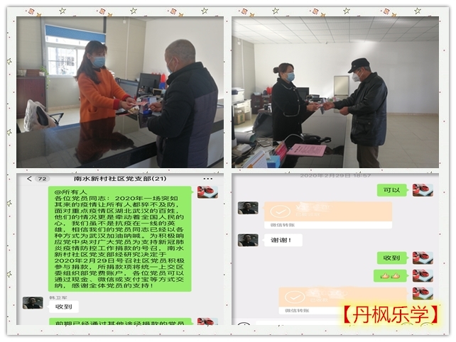 在当前全民防控新型冠状肺炎病毒疫情坚决打好疫情防控阻击战的非常时期,近日,南水新村社区居民学校党员线上线下积极响应上级街道关于组织党员捐款支持疫情防控的通知。3月1日下午,南水新村社区居民学校在党支部群里发布通知,捐款以“平等自愿”为原则,发布不到1个小时就不断收到线上捐款。