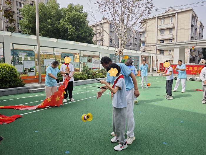随后的空竹表演同样精彩纷呈。志愿者们抖、抛、接、绕,小小的空竹在他们手中仿佛被赋予了生命,上下翻飞,嗡嗡作响,划出一道道优美的弧线。高难度的技巧动作引得全场惊呼不断,孩子们的脸上洋溢着兴奋与好奇的笑容。